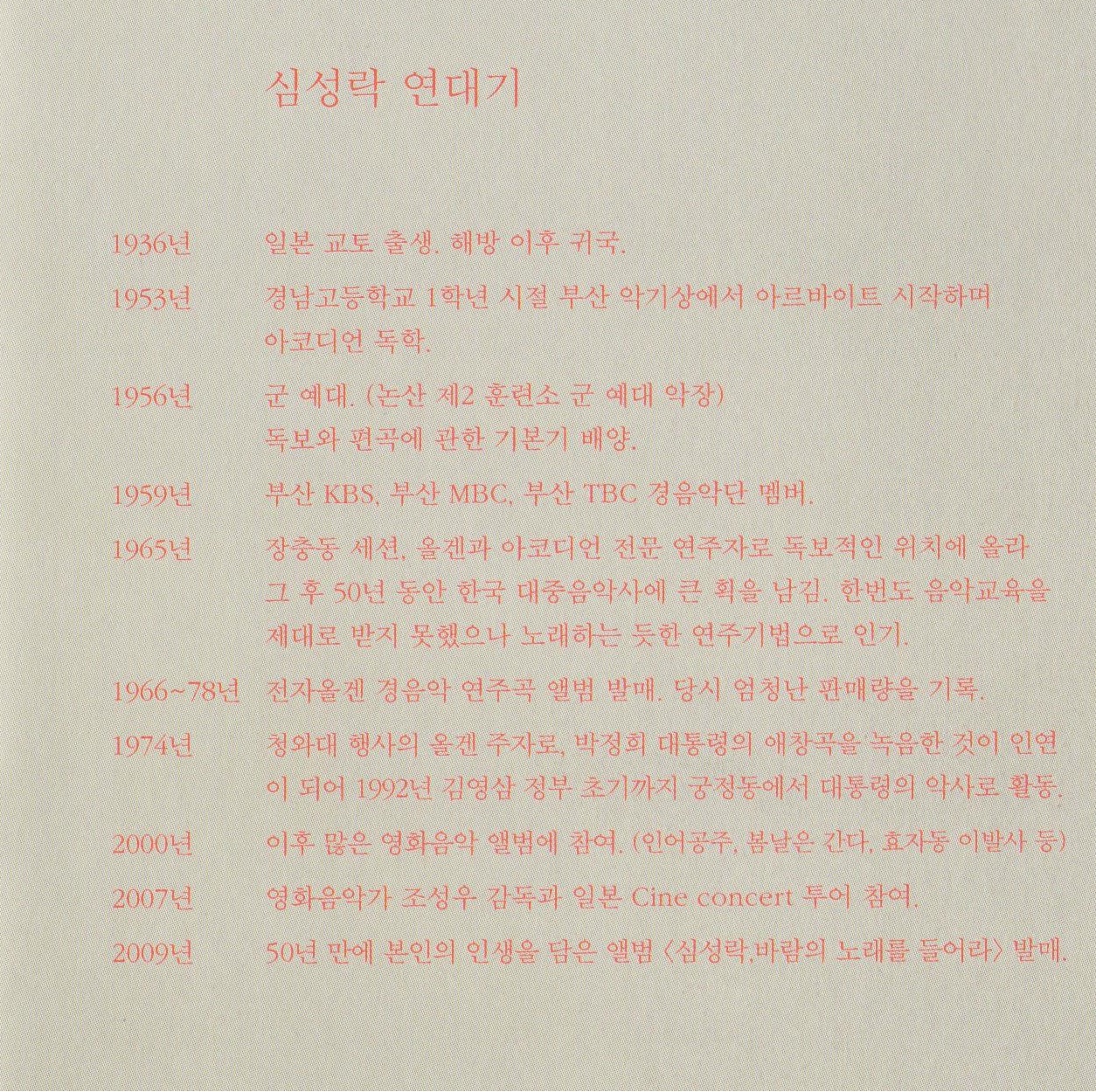 아코디언이라는 악기를 떠올릴 때 어떤 생각이 먼저 들까요? 이 앨범을 만나기 전까지 저는 아코디언은 뽕짝에나 사용하는 그저 경박스러운 악기일 뿐이라고 생각했습니다. 이 앨범으로 인해 아코디언에 대한 인식을 완전히 바꾸어 놓았습니다. 2009년 10월 15일에 발매된 이 앨범은 2021년 12월 4일 향년 85세의 나이로 작고한 아코디언 연주자 故심성락 선생의 데뷔앨범입니다. 2009년 발매 당시 73세로 우리나라 최고령 데뷔 앨범으로 화제가 되기도 했습니다.