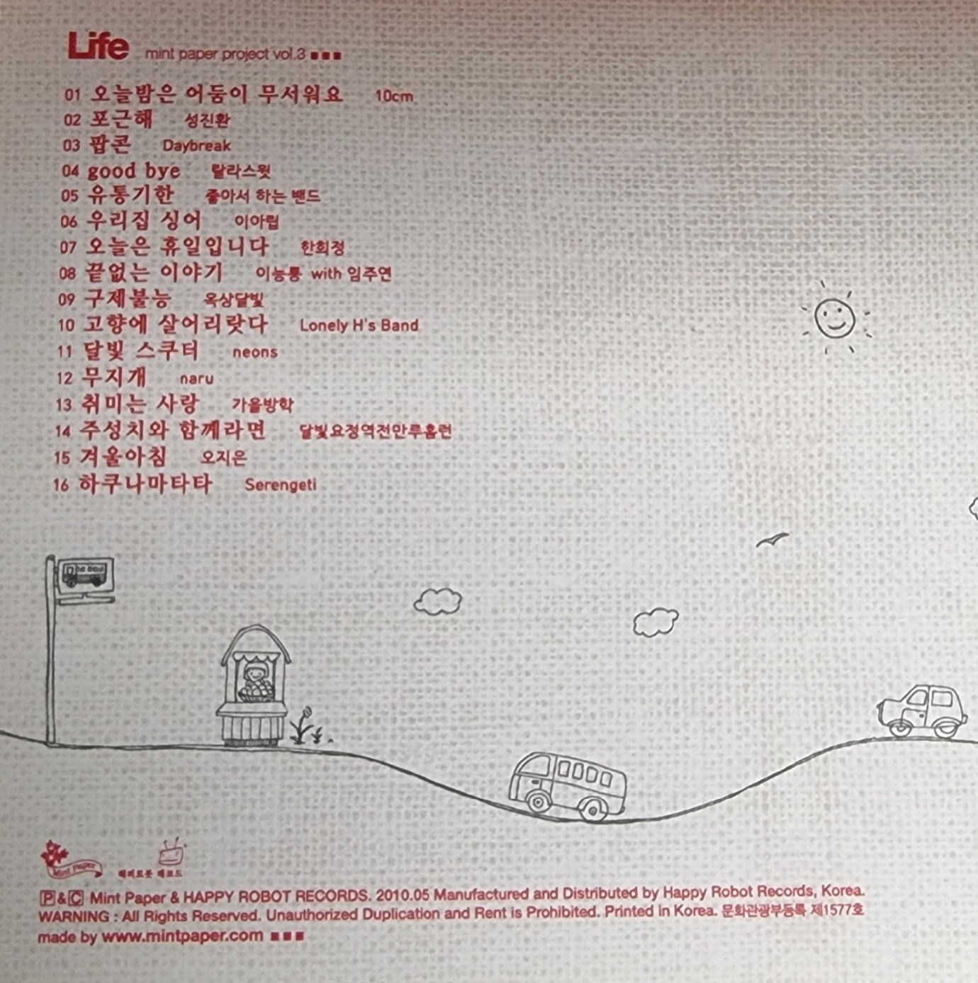 그런 홍대에 실력 있는 뮤지션들이 교류를 위해 다수가 참여하여 만든 앨범이 오늘 소개할 [Life]입니다. 이 앨범은 현재까지도 왕성한 활동을 하고 있는 문화공동체 [민트 페이퍼]에서 만든 세 번째 프로젝트 앨범입니다. 전작과는 다르게 일상의 소소한 이야기들을 담고 있습니다. 특히 이 앨범은 지금은 고인이 된 故달빛요정역전만루홈런(본명 : 이진원) 이 살아생전 마지막으로 참여한 앨범이기도 합니다. (유작 앨범 [너클볼 콤플렉스]가 있긴 하지만 그가 살아있을 때 마지막으로 참여한 앨범입니다.)